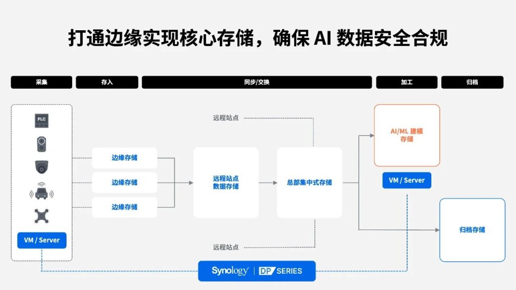 从边缘收集到的数据,例如:无人机影像、智驾系统数据、执法记录仪、PLC 等数据,通过边缘存储集中到远程站点后,再统一到总部机房,实现边缘数据的集中式存储及管理。而在此基础上,数据又可以进行大模型计算和语言训练等,最终通过统一备份来实现归档存储。这一流程打通边缘到核心,进一步实现 AI 大数据的全管理流程。