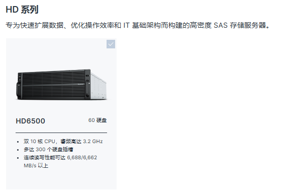 | HD 系列 | 高密度容量优化 | 单机高盘位、PB 级扩展、低单位TB成本 | 冷/温归档、监控录像、备份中心 |
