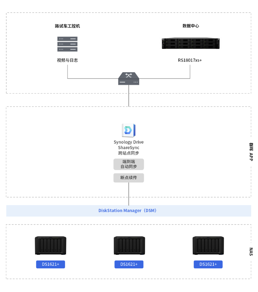 为解决这一问题,该智驾企业采购 200 台群晖 DS1621+ 作为随车数据采集存储节点,群晖支持 NFS v3/v4/v4.1 协议,再配置 6 块 SSD 组成全闪存阵列,RAID 6 阵列提供硬件容错,高速写入保障多路测试视频与日志稳定写入不卡顿。先前仅能保存 1 小时测试视频,部署后测试数据可用写入时长提升 400%。每台 DS1621+ 完成路试回厂后,通过群晖 Drive ShareSync 套件自动回传随车采集数据,汇总至数据中心的群晖 RS18017xs+,实现集中管理。
