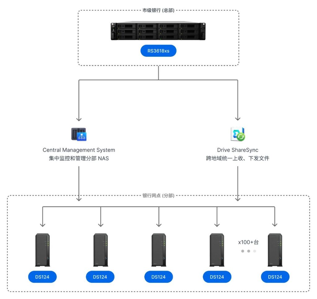 某农商银行在总部架设了一台 RS3618xs,担任文件管理与下发的核心枢纽,各银行网点部署 1 台 DS124,形成一张覆盖各网点的存储网络。借助自定义自动清理脚本,在所有网点 NAS 上实现非必需数据的自动化、无遗漏定期删除,既保障了跨区域文件同步效率,又完全满足金融行业安全合规要求。