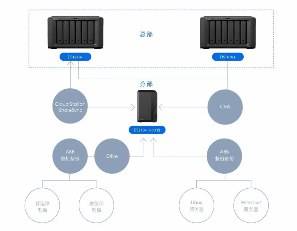 某大型连锁超市,总部在北京,共有 200 多家分店,在总部部署 2 台群晖 DS1618+,在各分店部署了 80 台 DS218+。各分店 DS218 + 自动备份本地 Linux 服务器与 Windows 办公电脑数据,再通过多站点同步功能将文件统一归档至总部 DS1618+。总部 IT 人员借助群晖 CMS 套件,可远程统一配置、监控所有分部 NAS 设备,实现多站点数据的集中化、可视化管理。