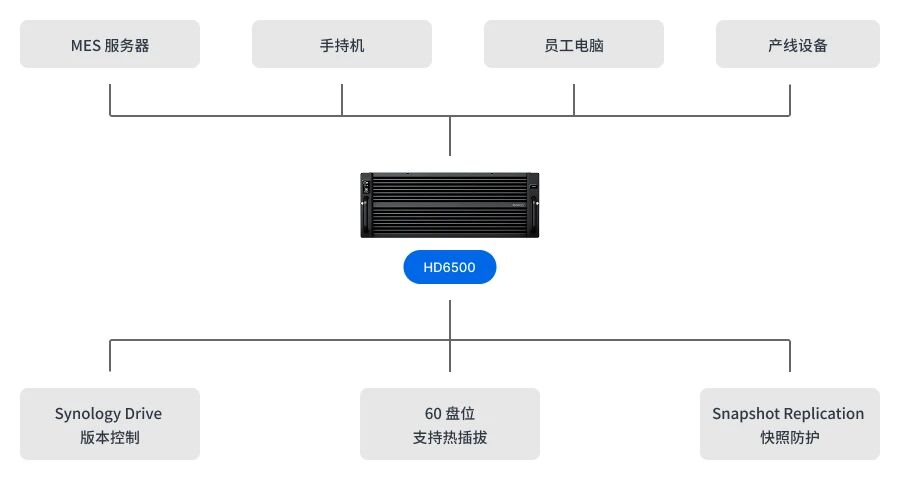 公司部署 2 台 群晖高密度存储 HD6500,每台配置 60 块 20TB 硬盘,总容量 2 PB。针对 MES 系统生产数据以及其他数据存储的需求,管理员在统一界面中监控和管理所有存储设备,无需反复人工拆盘来迁移数据。原先单次硬盘迁移需停机 2 小时(含拆装、数据拷贝、验证),而群晖 NAS 凭借内置的 RAID 自动重建和精准修复功能,单次维护时间缩短至 15 分钟,效率提升了 87.5%.原先需 2 名专职人员每月耗费约 40 小时处理存储维护,现通过集中化管理界面与自动化工具,人力投入减少至约 8 小时/月,综合运维成本降低 80%。